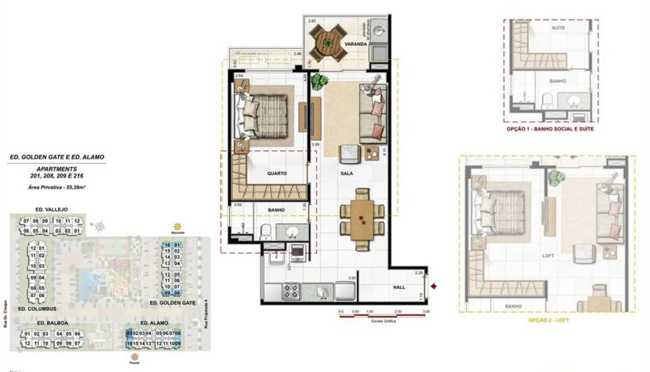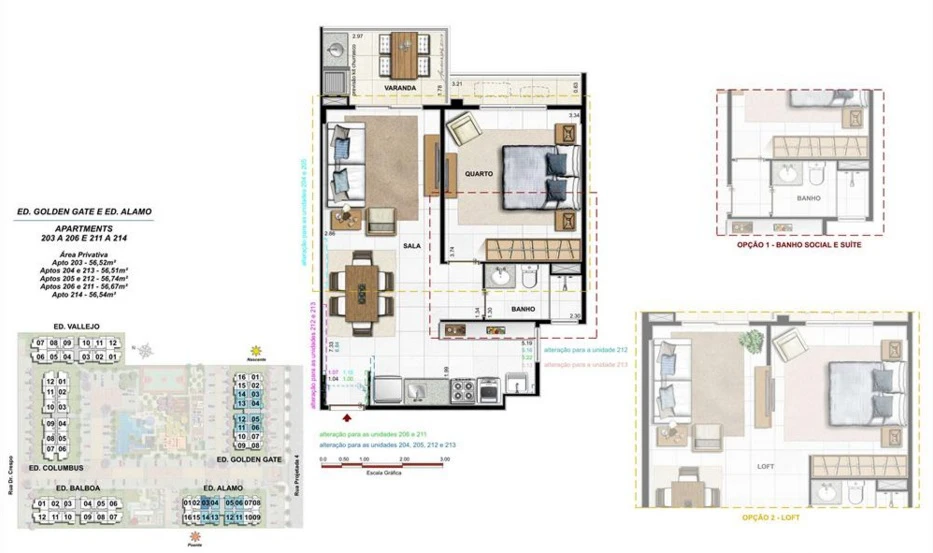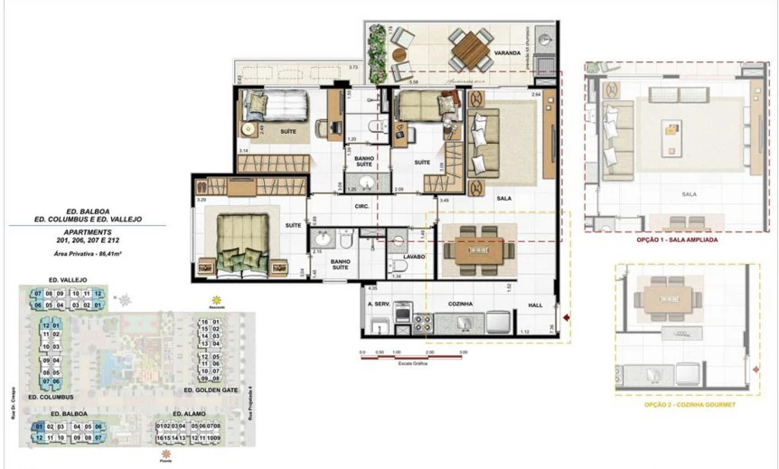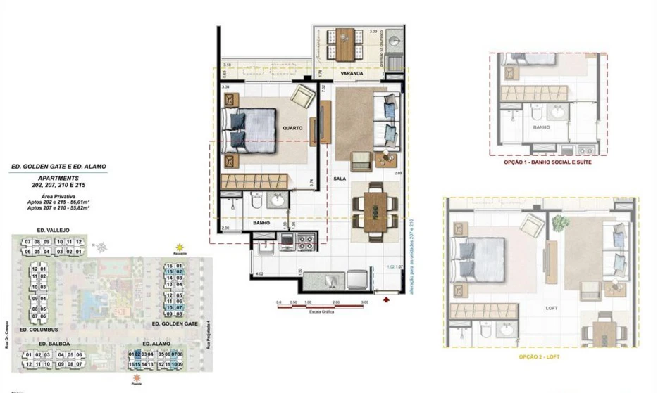 Apartamento de 1 Quarto – 56m² / Apartamentos de 3 Quartos com 86m²;