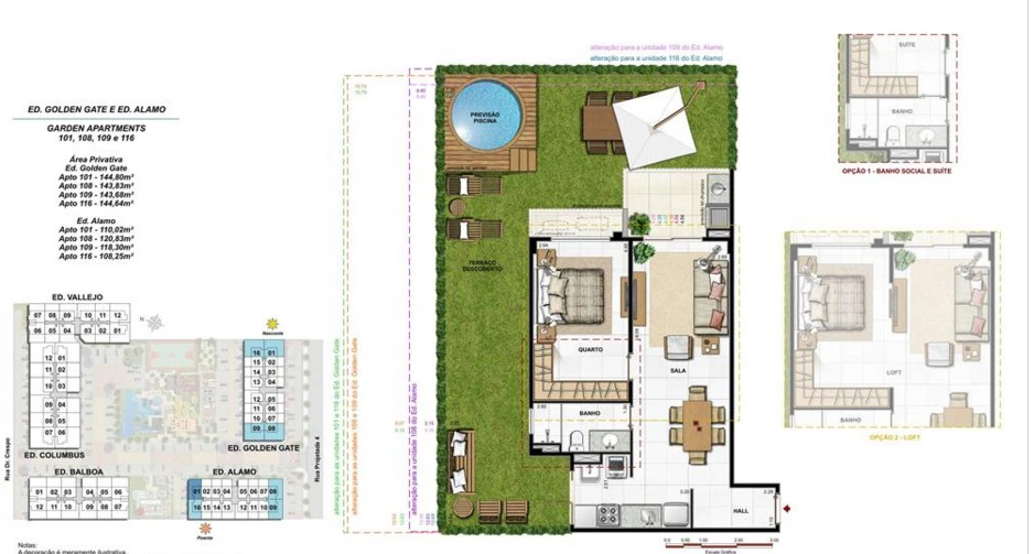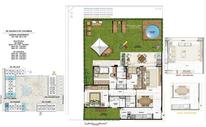 Apartamentos de 2 Quartos Garden – 106m² até 142m² / Apartamentos de 3 Quartos Garden – 134m² até 217m²;